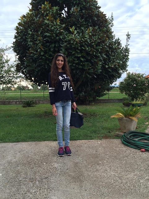 Per uscire oggi pomeriggio in questi freschi giorni di autunno, (Ma ne vogliamo parlare?! Purtroppo è arrivato all'improvviso!!) ho scelto una felpa leggera blu navy con scritta in stampa bianca NYC, modello molto sportivo che rimanda la mente ai giocatori di football, poichè proprio ad esso ispirata (Pull&Bear) Jeans con brillantini applicati, skinny, Bershka e scarpe da ginnastica Sneakers Up blu con dettagli e lacci fucsia e dettagli anche in argento brillante. Accessori: Borsa in tinta blu navy Hervé Chapelier, bracciale ed orecchini Tiffany, orologio Casio oro. Trucco: sulle tonalità cromatiche del blu, dal più scuro al più chiaro, ombretto e matita per gli occhi in tinta; Poi fard, rimmel e lipgloss rosso brillante. Capelli sciolti e ricci, con un cerchietto celeste con applicazioni di strass brillanti in tinta.